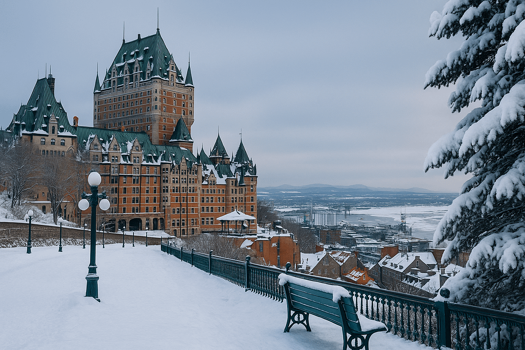 Across the ocean, Quebec City in Canada becomes a real-life snow globe. Its cobblestone streets, French charm, and stone walls transform into a fairytale once the snow begins to fall.