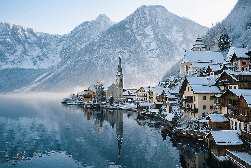 Further east, Hallstatt, Austria, offers quiet perfection. Perched beside a still alpine lake and framed by towering peaks, it’s a village that looks like it belongs on a Christmas card. When the snow falls, smoke curls gently from chimneys, and the reflection of church lights shimmers on the icy water. Hallstatt is small, peaceful, and almost surreal — a place for those who seek calm rather than crowds.