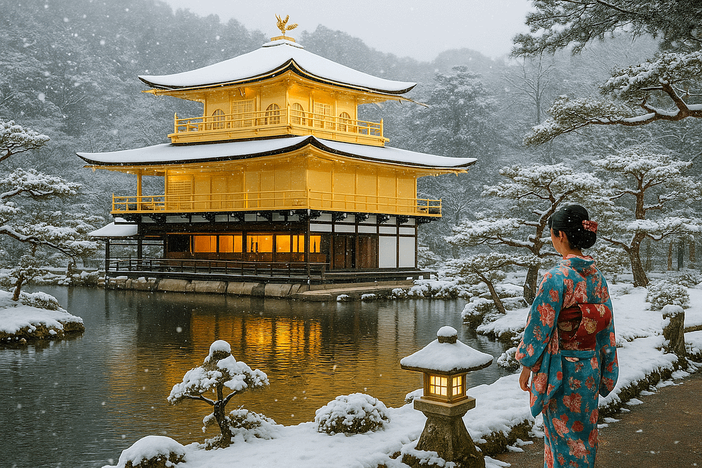 Winter brings a quiet, poetic beauty to Kyoto. The city’s ancient temples and serene gardens shimmer beneath soft layers of snow, offering a peaceful escape from the modern world. Wander through the snow-dusted paths of the Philosopher’s Walk, or visit Kinkaku-ji, the Golden Pavilion, glowing like a jewel against a white backdrop. In the evenings, sip warm matcha in a traditional teahouse as the city’s lanterns cast a gentle light across the frozen ponds — a true glimpse of Japan’s timeless grace.